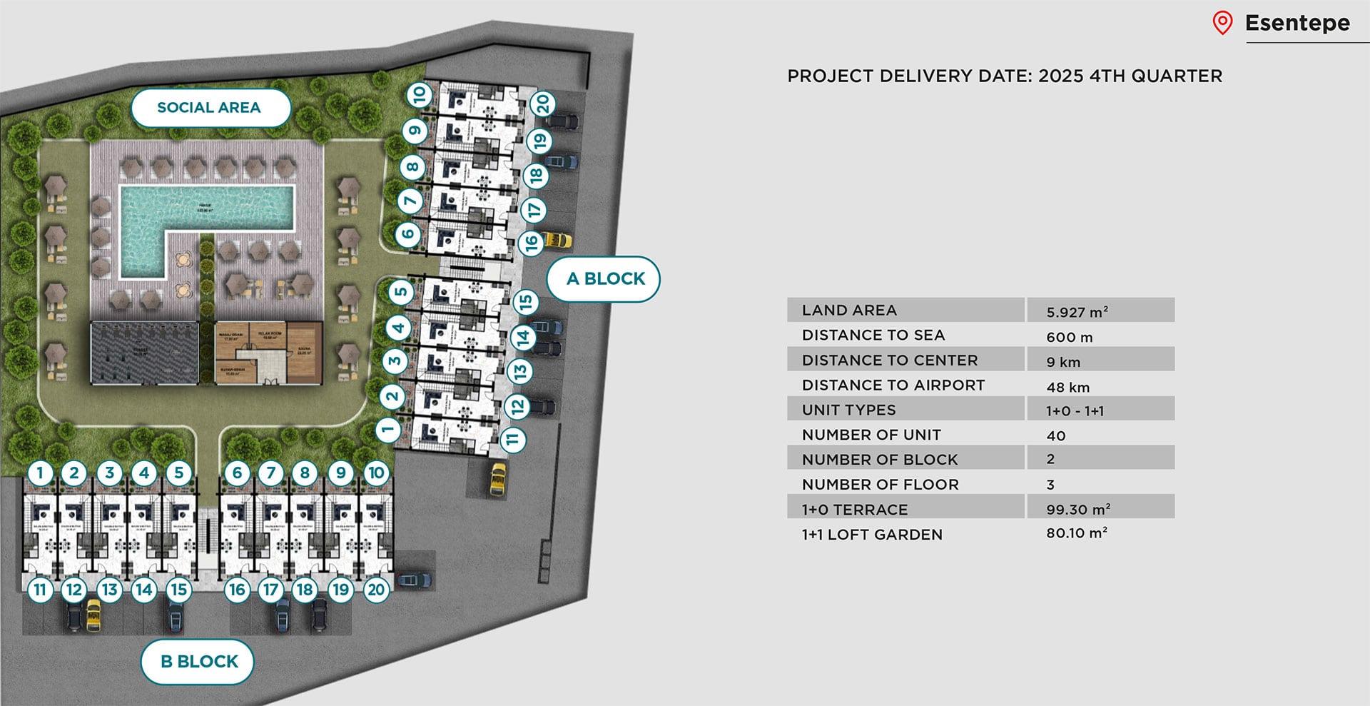 Due to its location, The Aqua Blue project is in nature, within walking distance to the sea, it is located in an area away from the noise and city crowds. It is also close to both the city, shoppng centers and historical places.