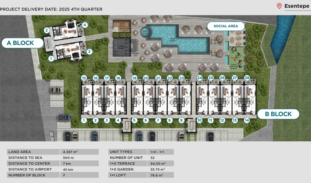 "Heaven’s Hill Village" is a modern complex nestled in the picturesque Esentepe area of Northern Cyprus. It offers a variety of accommodation options including spacious apartments, impressive bungalows and luxurious villas.