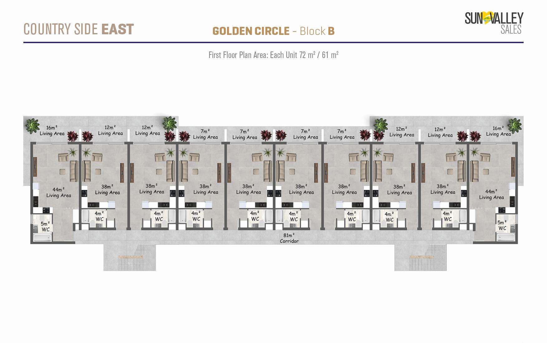| B1 | Corner studio | Garden | 44 | 16 | 60 | – | – | – | RESERVED |
