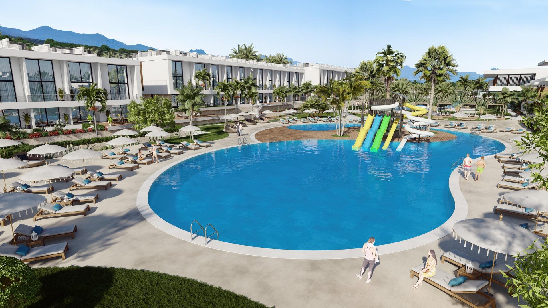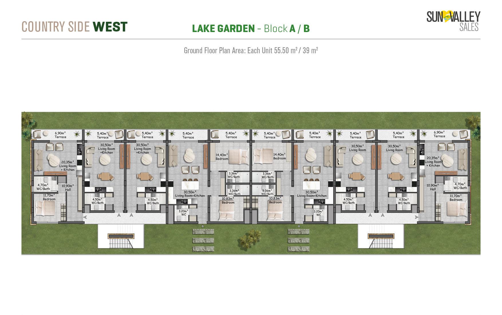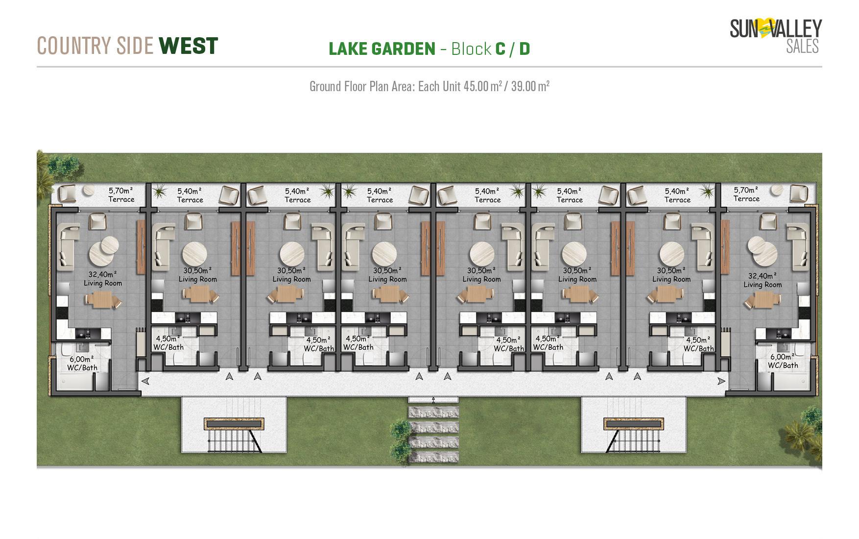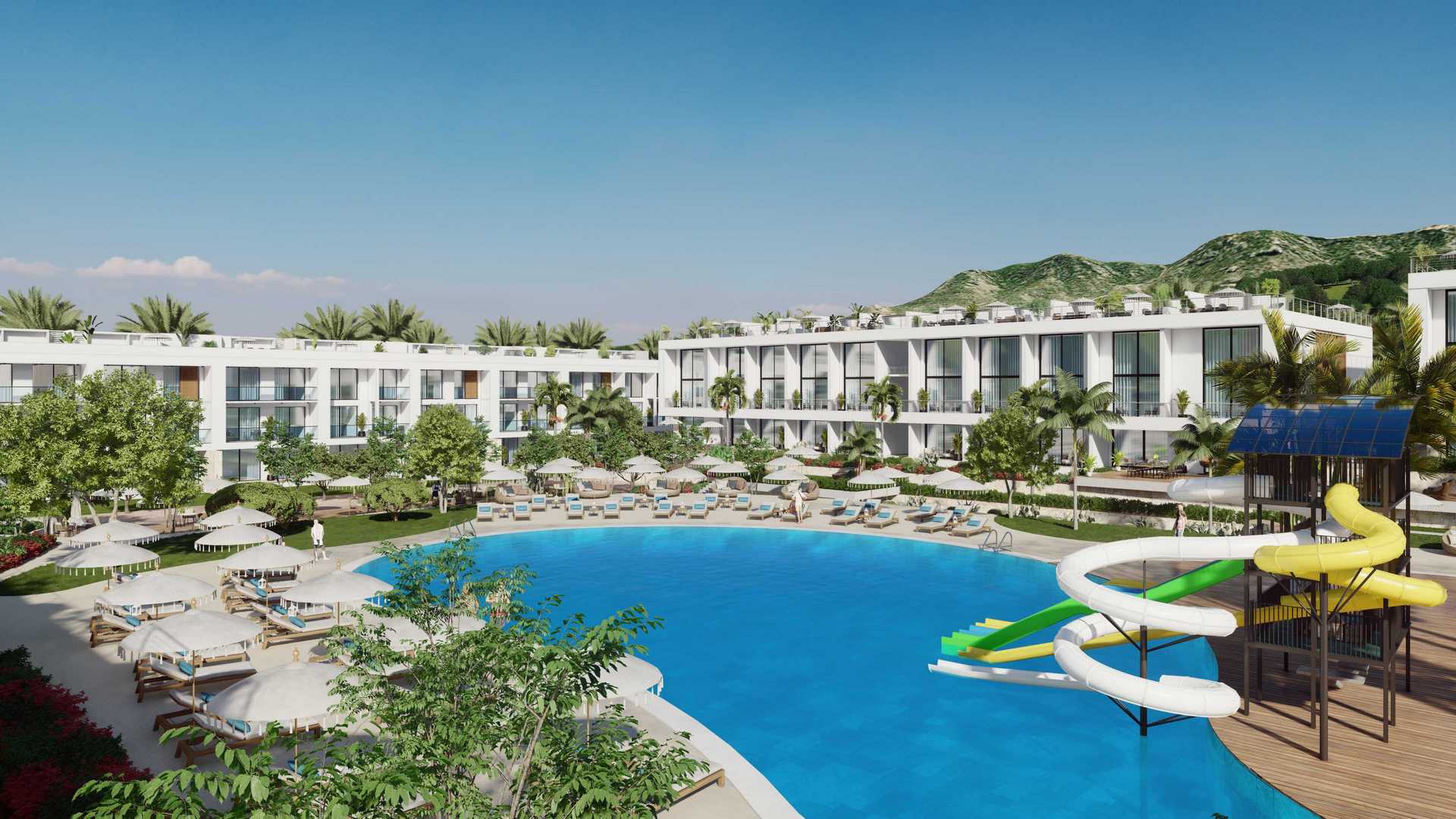 Lake Garden Village, located around the largest activity area of the project, offers apartments with a vibrant atmosphere. Residents can enjoy a café, indoor and outdoor playgrounds for children, a skateboard area, tennis and basketball courts, beach volleyball courts, scenic walking paths, cozy seating areas, lush gardens and a charming pond. Most apartments have spectacular sunset views overlooking the sea, mountains and the valley, creating a truly magical atmosphere.