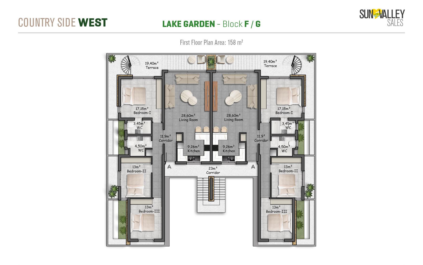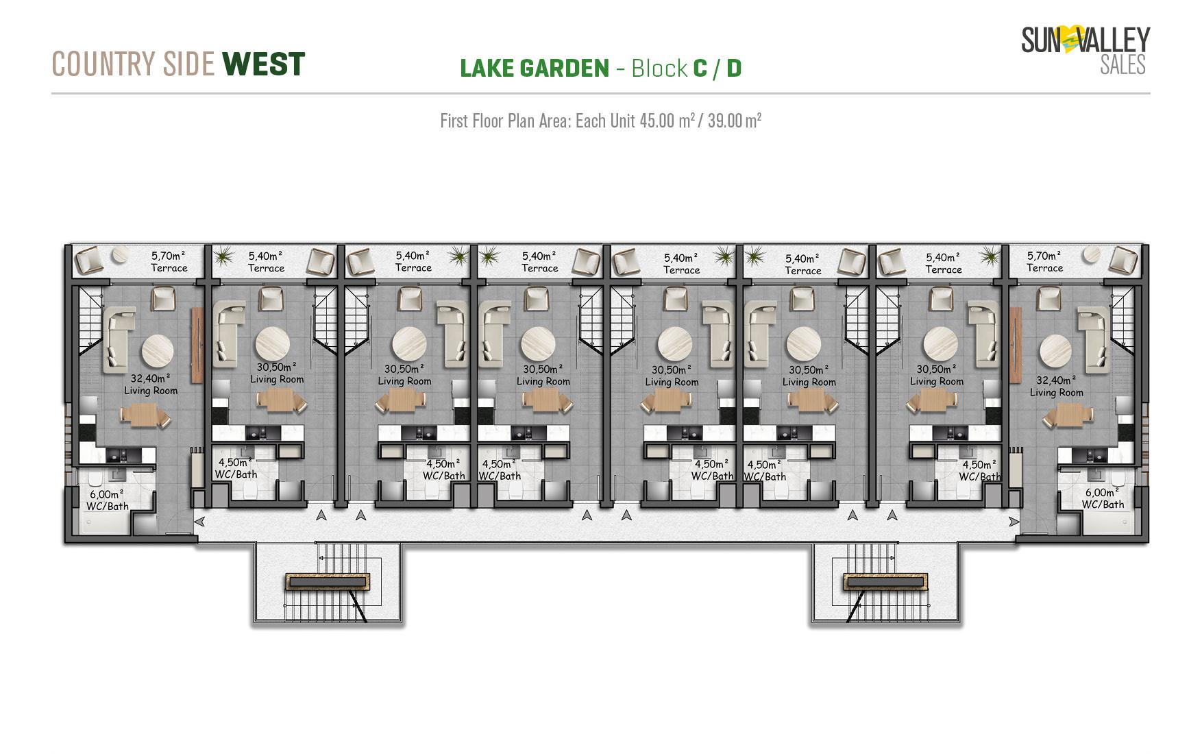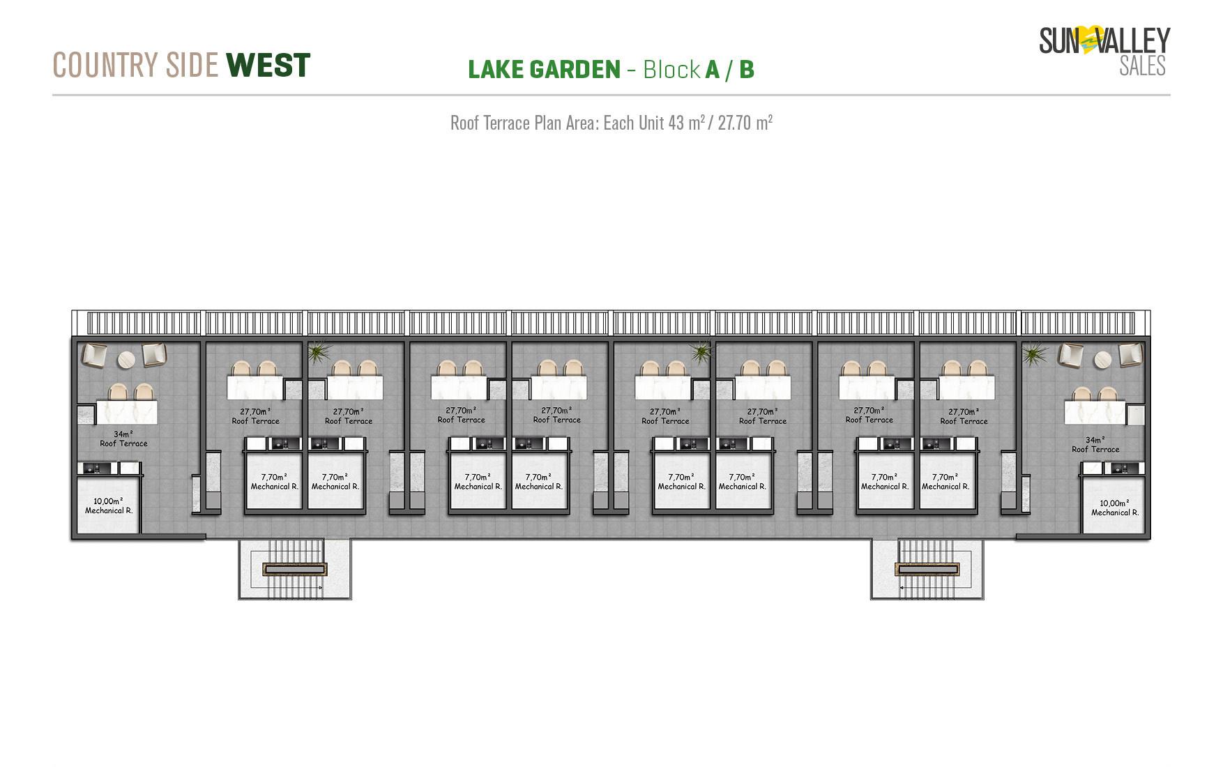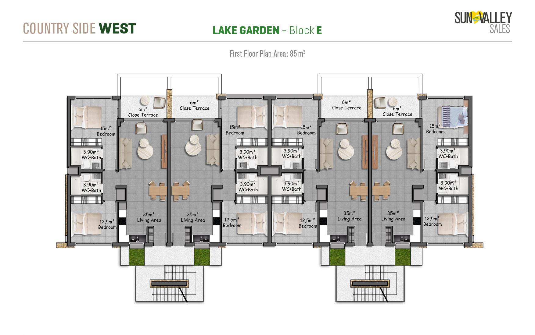 Lake Garden Village, located around the largest activity area of the project, offers apartments with a vibrant atmosphere. Residents can enjoy a café, indoor and outdoor playgrounds for children, a skateboard area, tennis and basketball courts, beach volleyball courts, scenic walking paths, cozy seating areas, lush gardens and a charming pond. Most apartments have spectacular sunset views overlooking the sea, mountains and the valley, creating a truly magical atmosphere.
