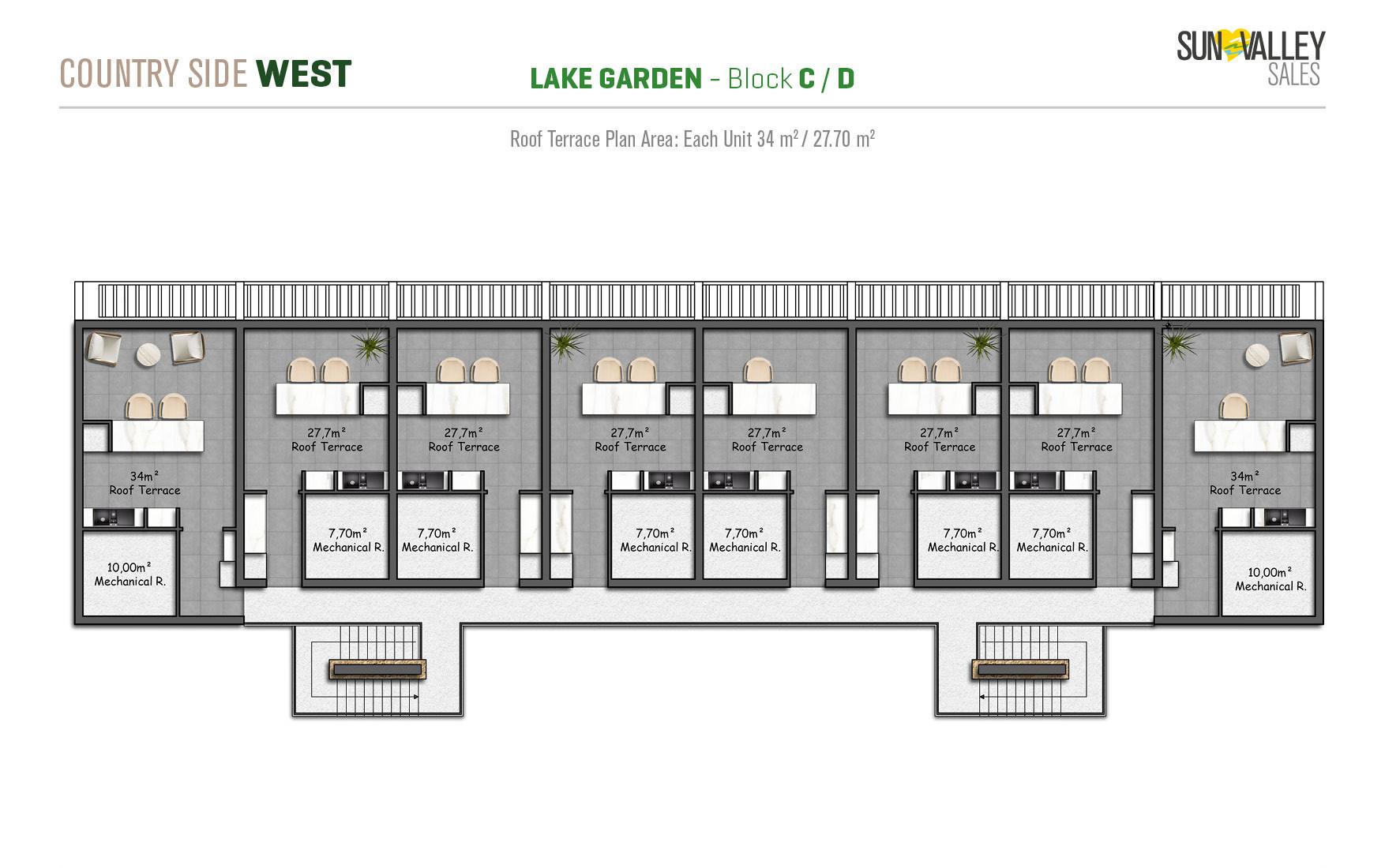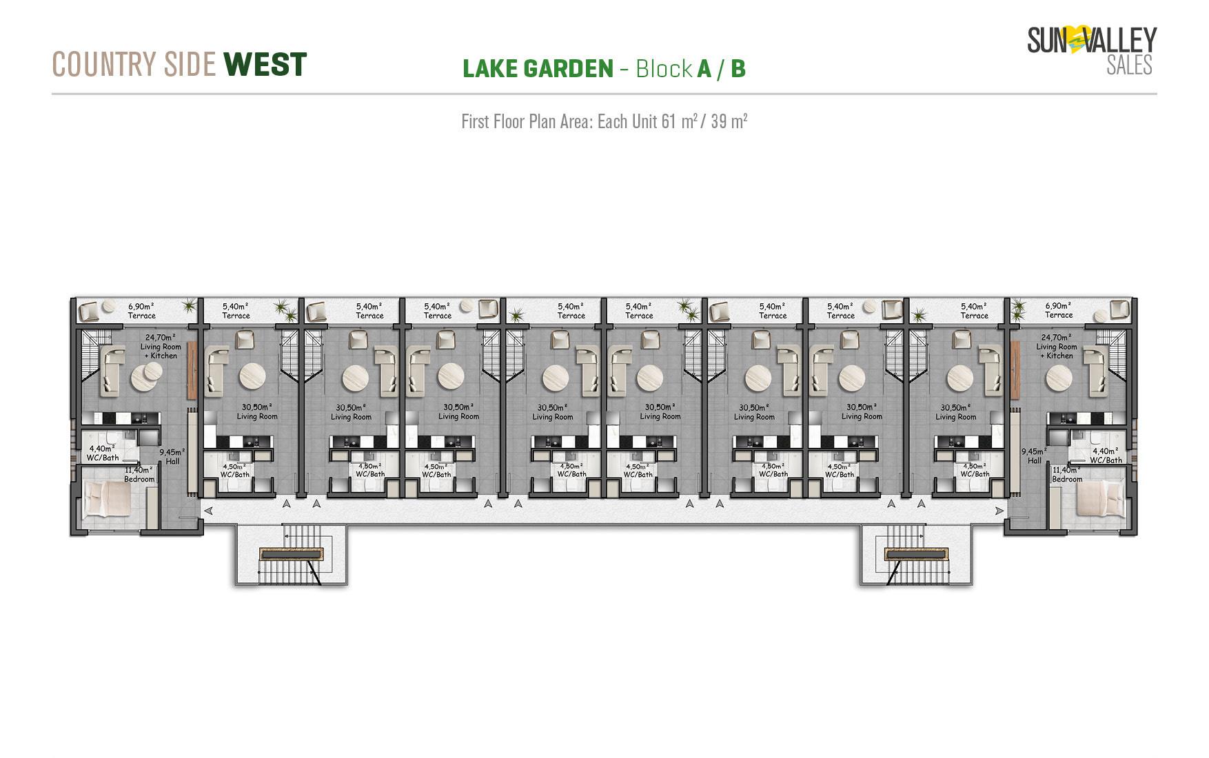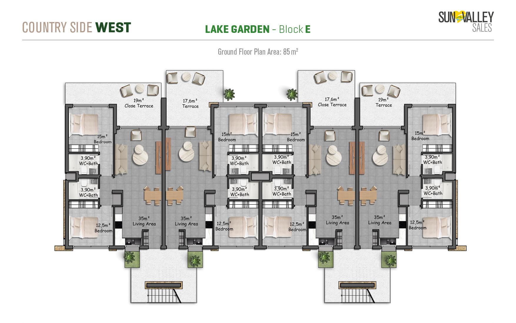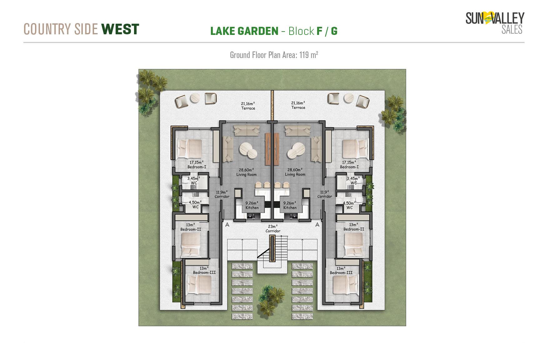 Lake Garden Village, located around the largest activity area of the project, offers apartments with a vibrant atmosphere. Residents can enjoy a café, indoor and outdoor playgrounds for children, a skateboard area, tennis and basketball courts, beach volleyball courts, scenic walking paths, cozy seating areas, lush gardens and a charming pond. Most apartments have spectacular sunset views overlooking the sea, mountains and the valley, creating a truly magical atmosphere.