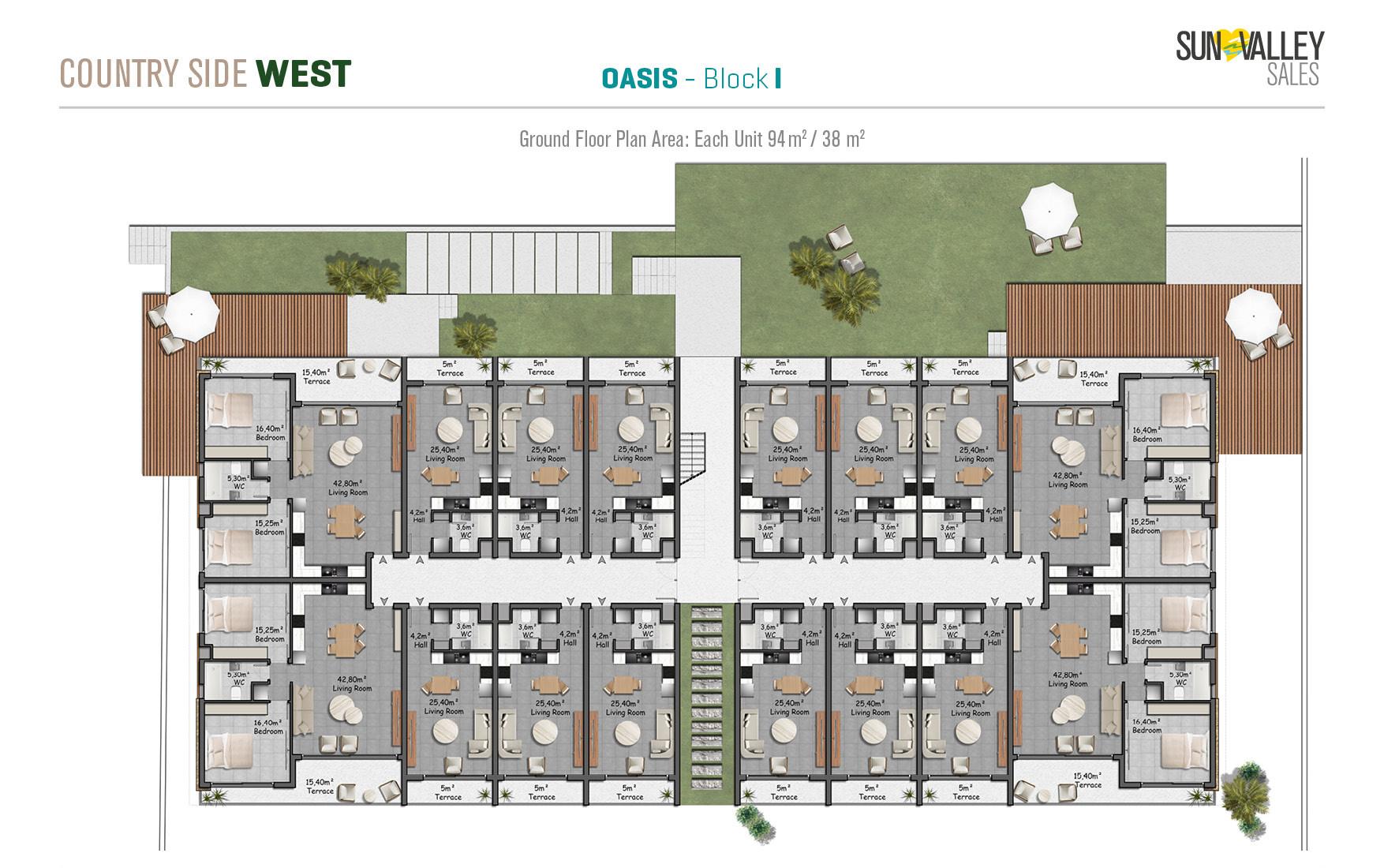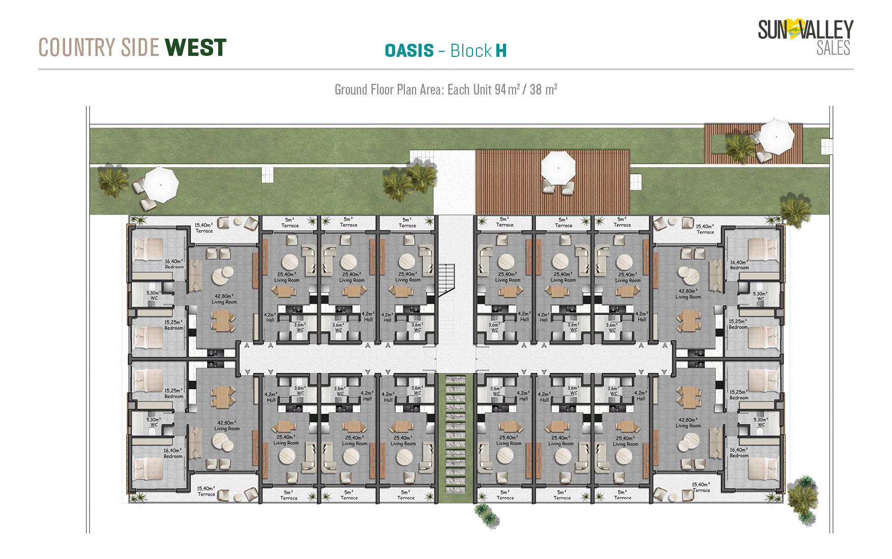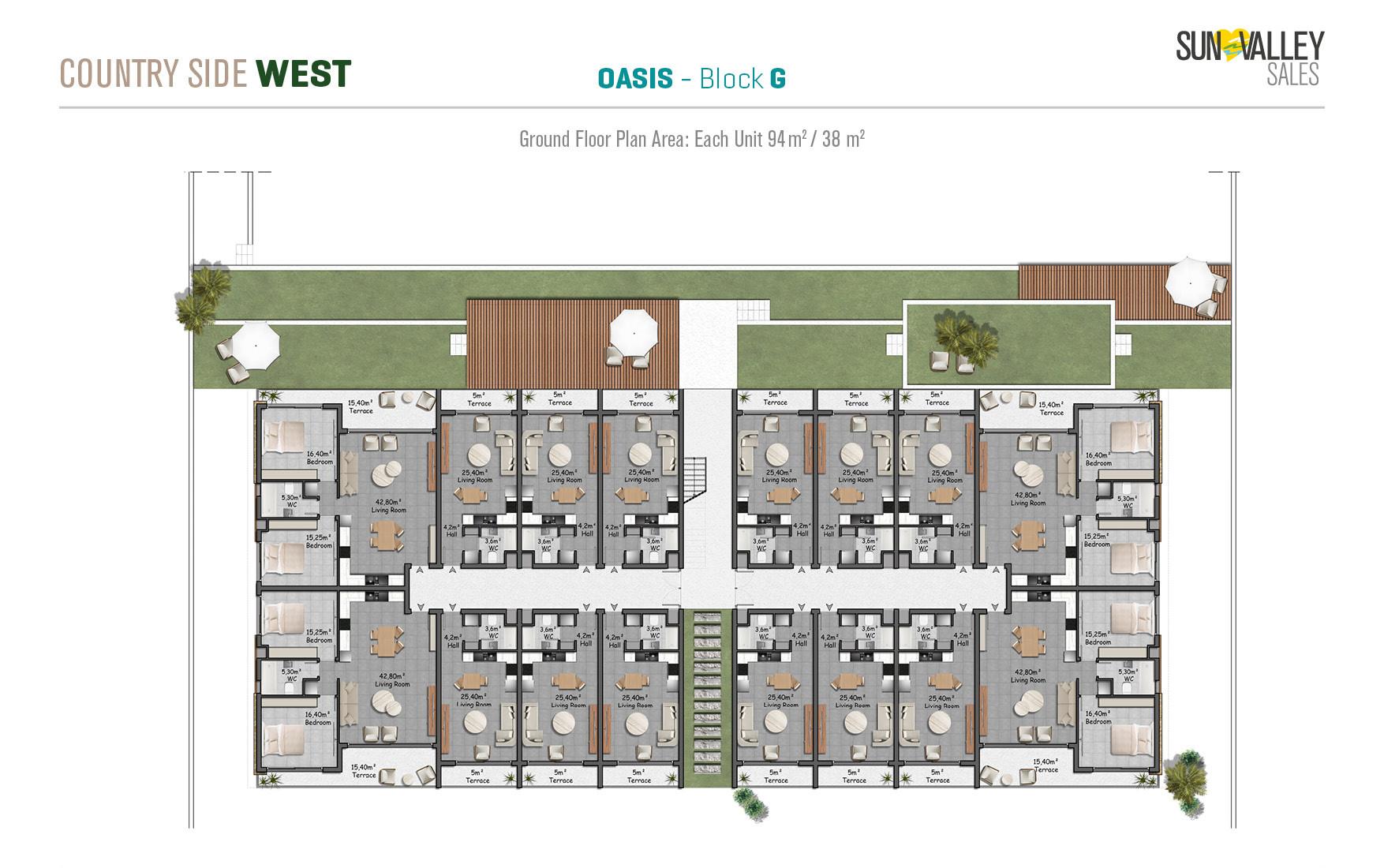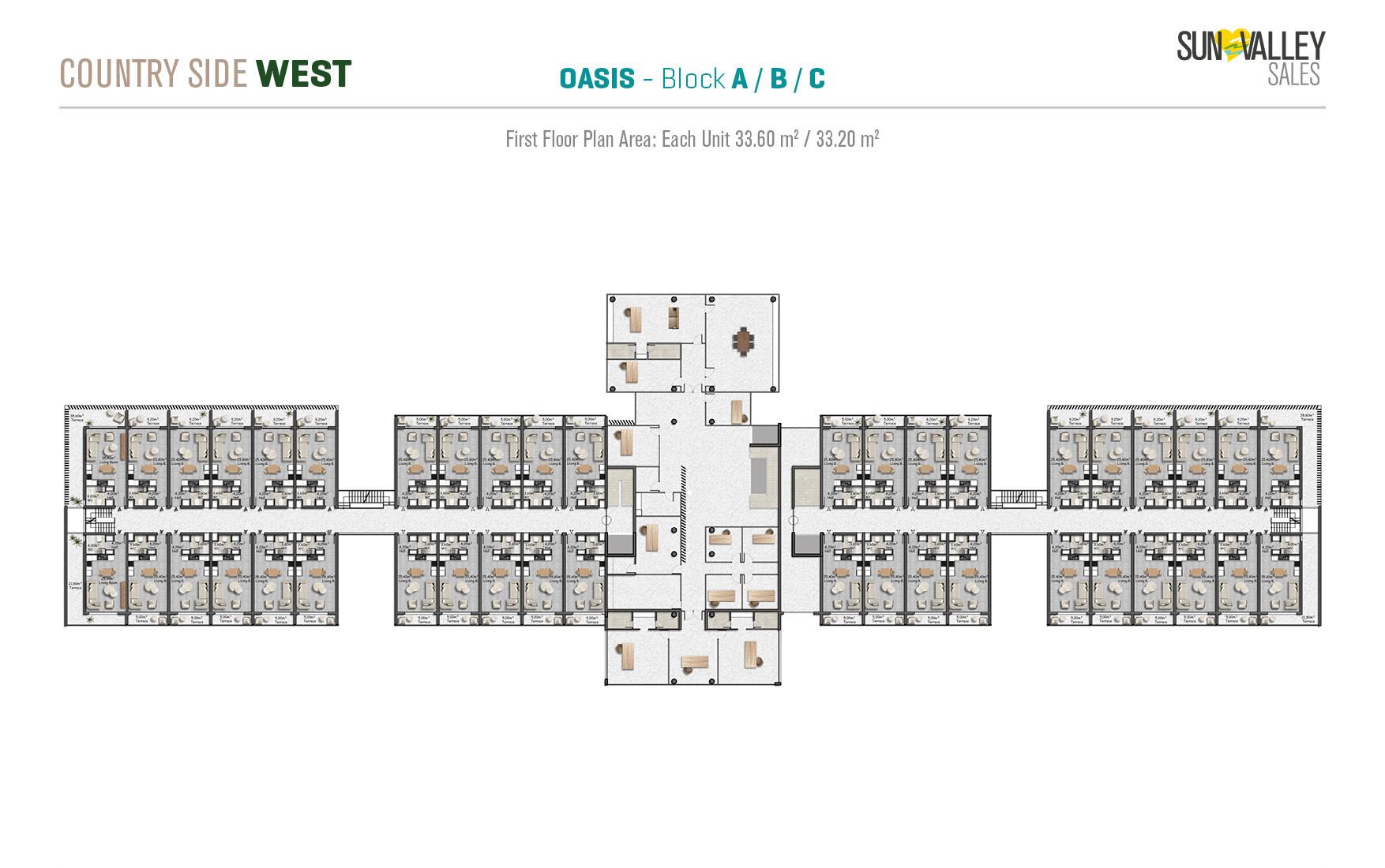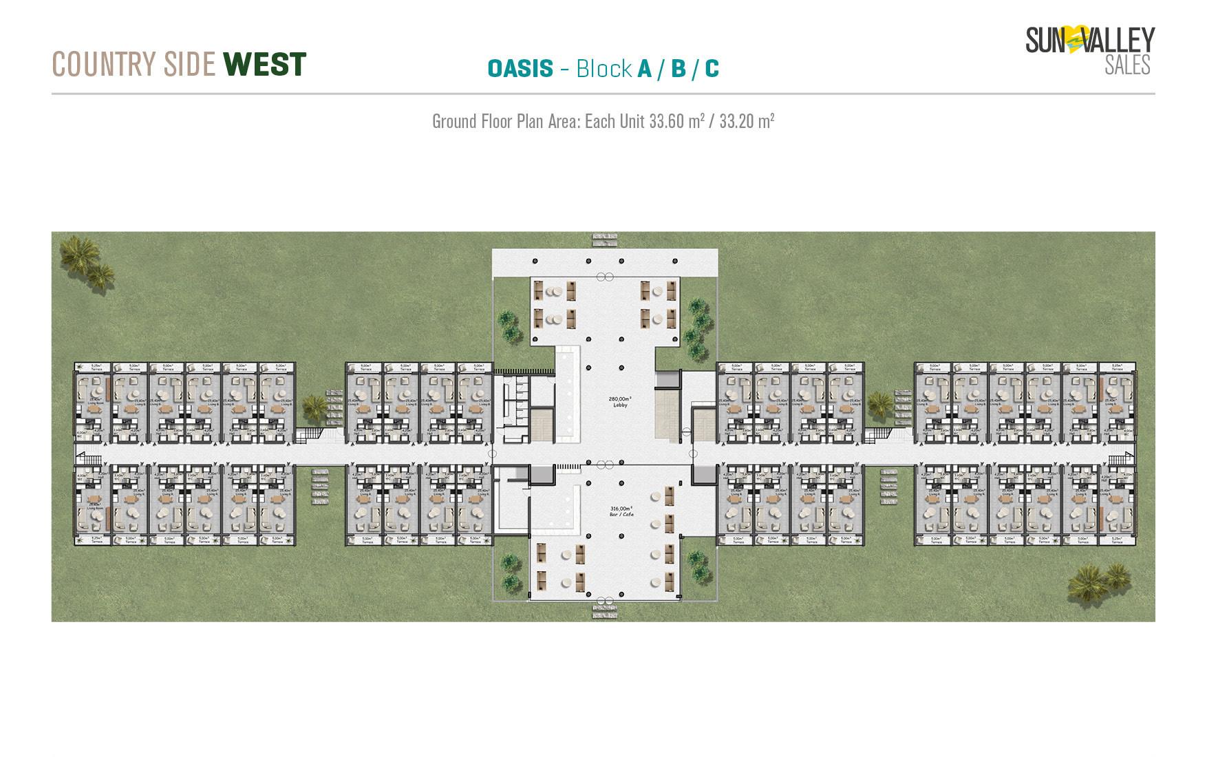 The centrepiece of Countryside West is Oasis Village, where 370 apartments are surrounded by two spacious swimming pools – a main pool and a family pool. The complex offers a range of facilities including a restaurant, cafe, pool bar and a hotel lobby with a reception desk that serves residents and guests. With a diverse range of properties and breathtaking sea and mountain views, Oasis Village guarantees an ideal quality of living.