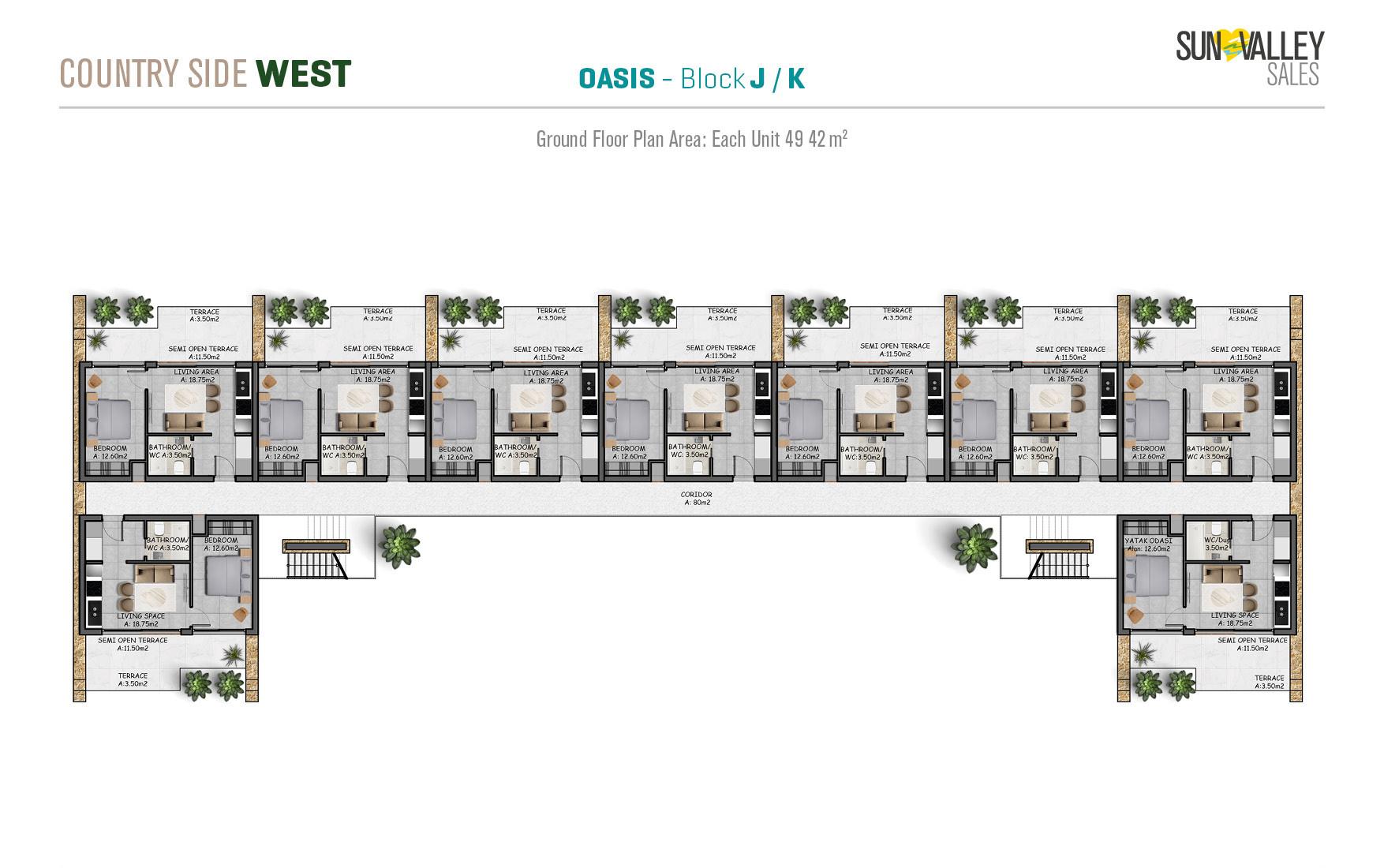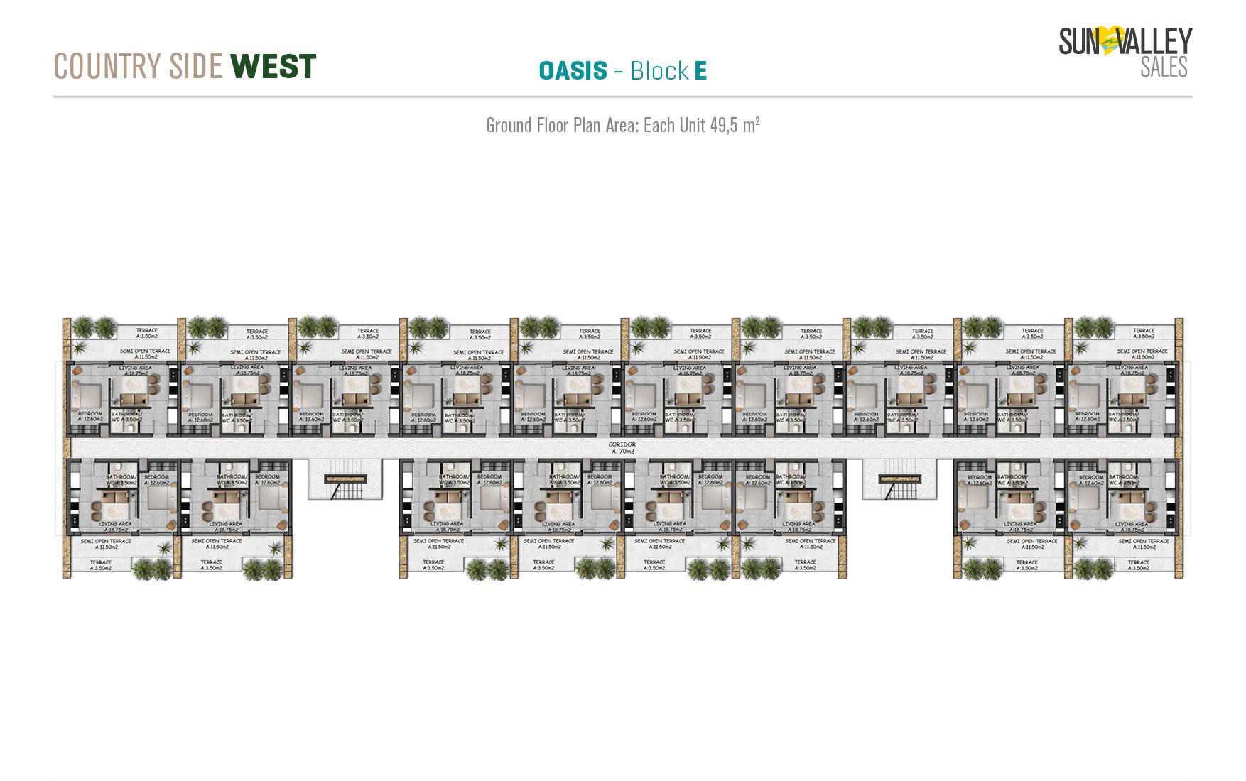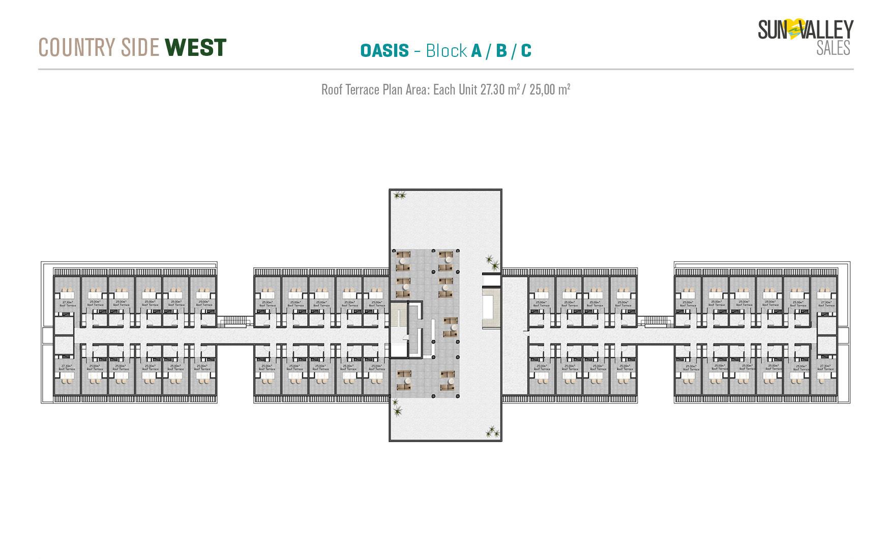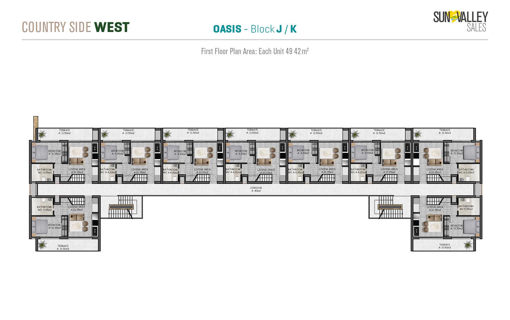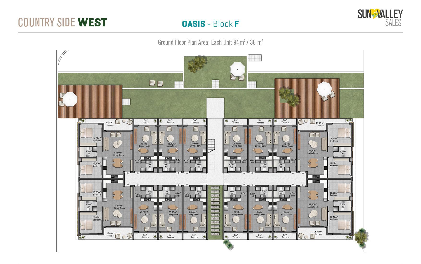 The centrepiece of Countryside West is Oasis Village, where 370 apartments are surrounded by two spacious swimming pools – a main pool and a family pool. The complex offers a range of facilities including a restaurant, cafe, pool bar and a hotel lobby with a reception desk that serves residents and guests. With a diverse range of properties and breathtaking sea and mountain views, Oasis Village guarantees an ideal quality of living.