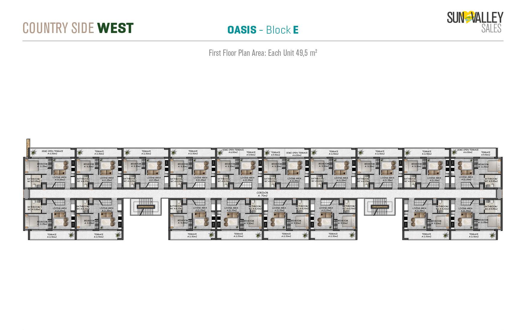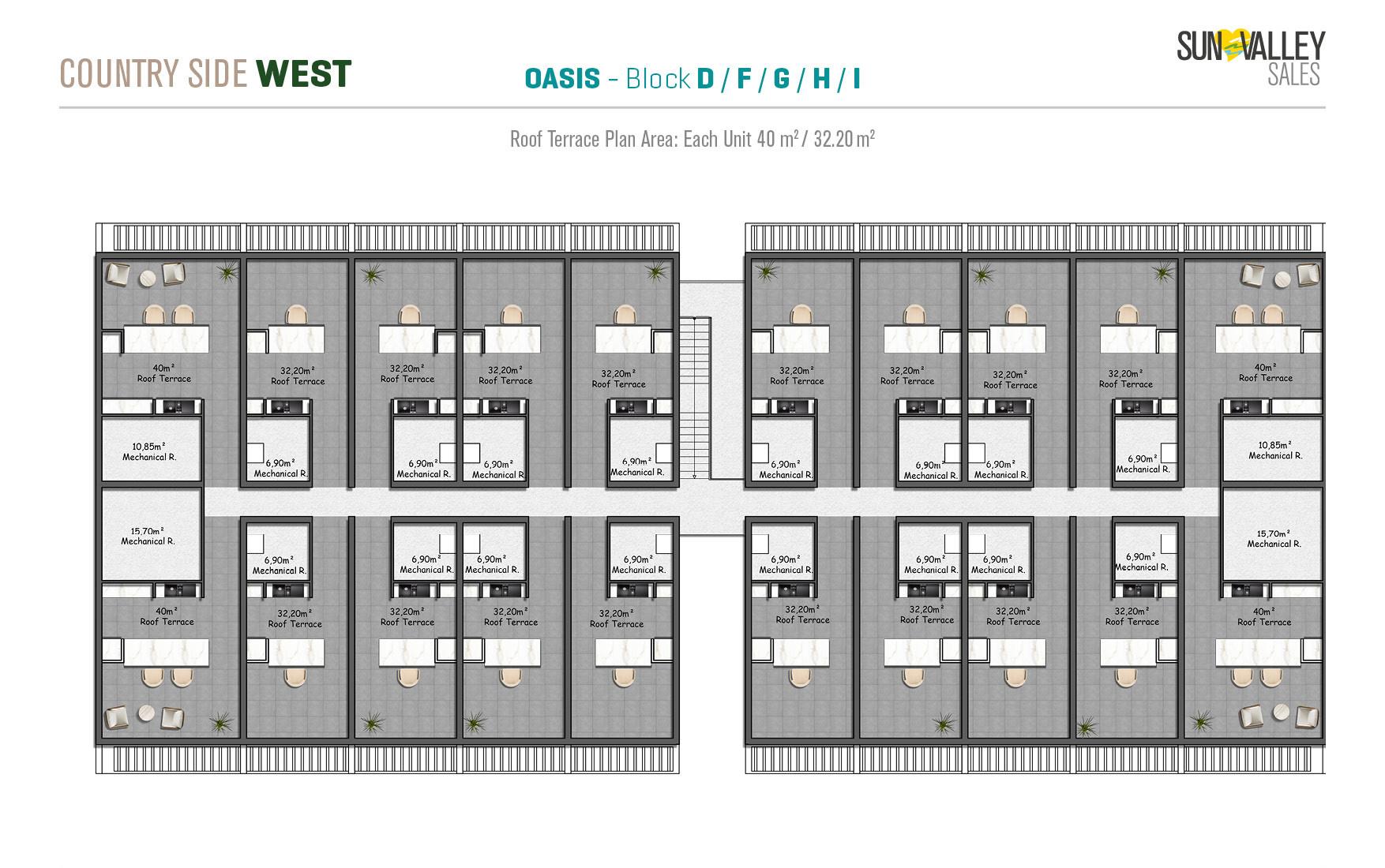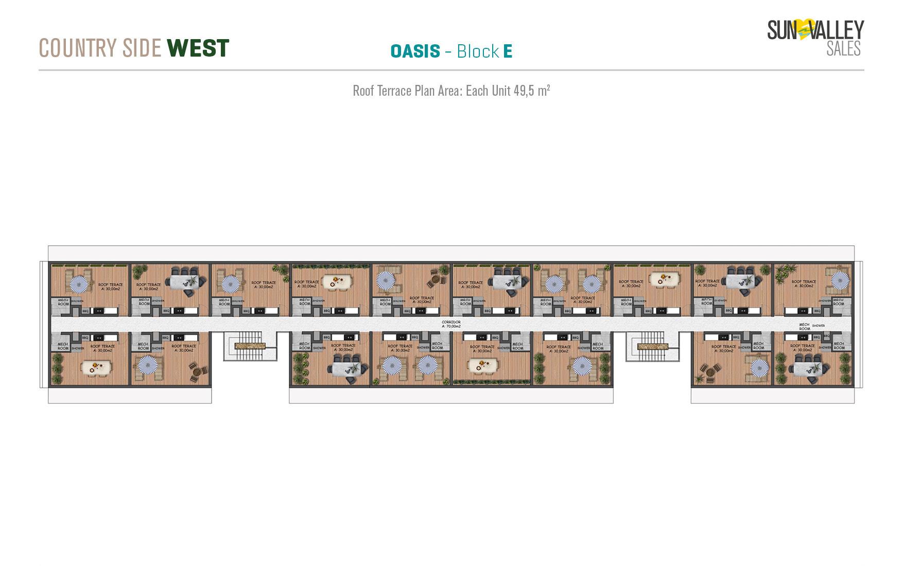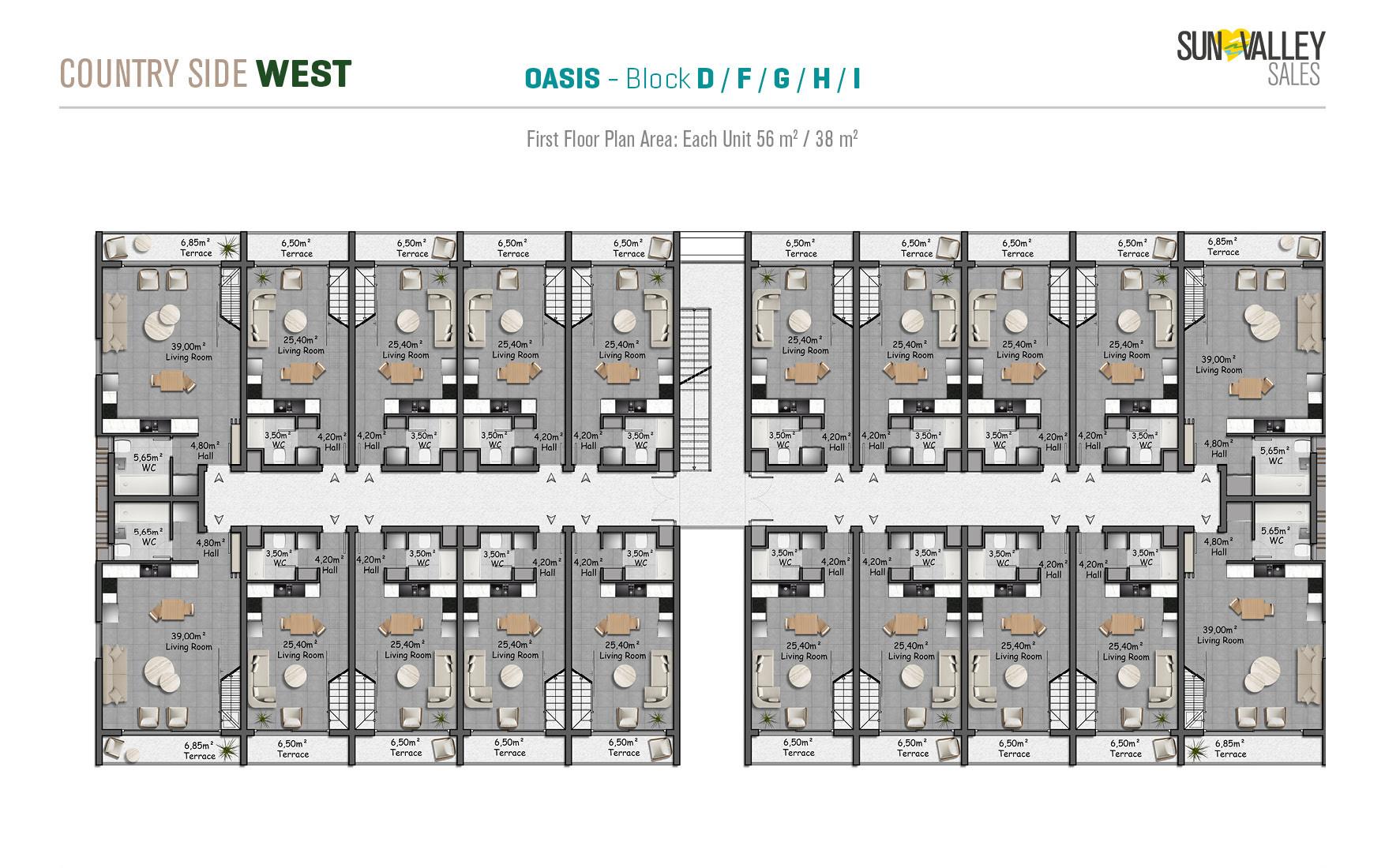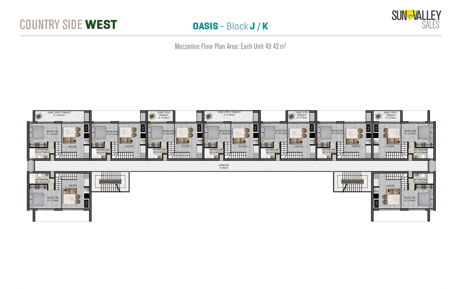 The centrepiece of Countryside West is Oasis Village, where 370 apartments are surrounded by two spacious swimming pools – a main pool and a family pool. The complex offers a range of facilities including a restaurant, cafe, pool bar and a hotel lobby with a reception desk that serves residents and guests. With a diverse range of properties and breathtaking sea and mountain views, Oasis Village guarantees an ideal quality of living.